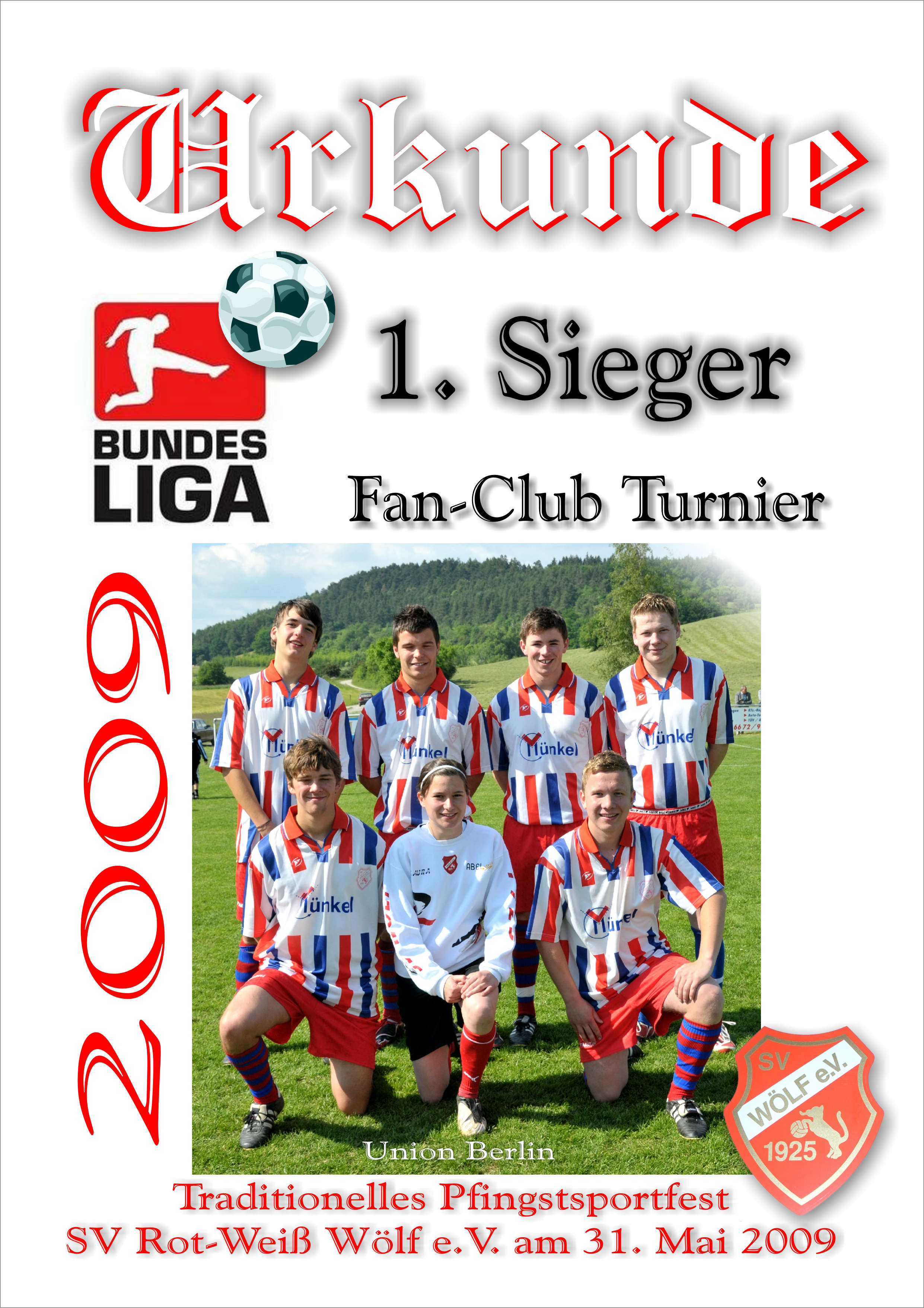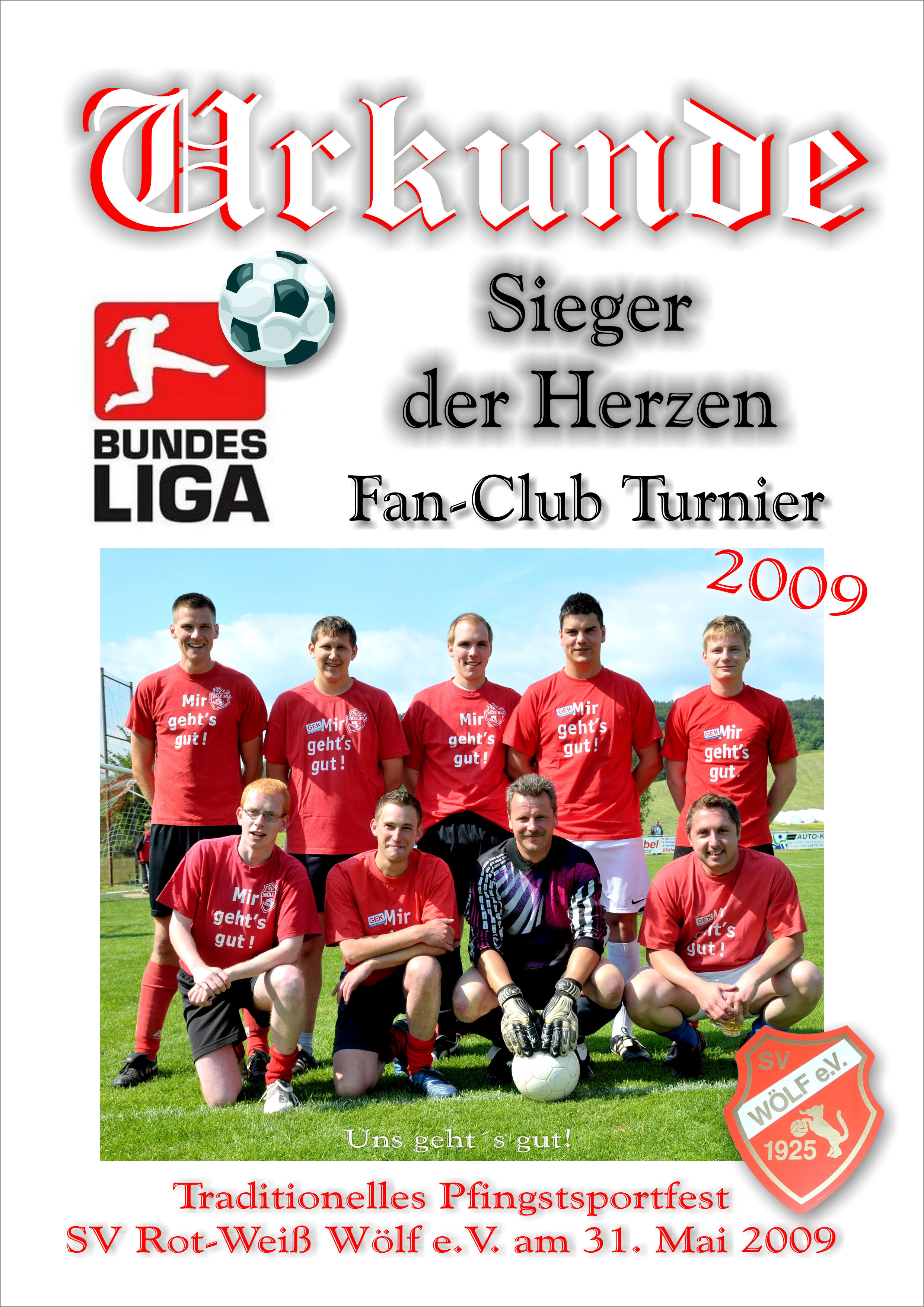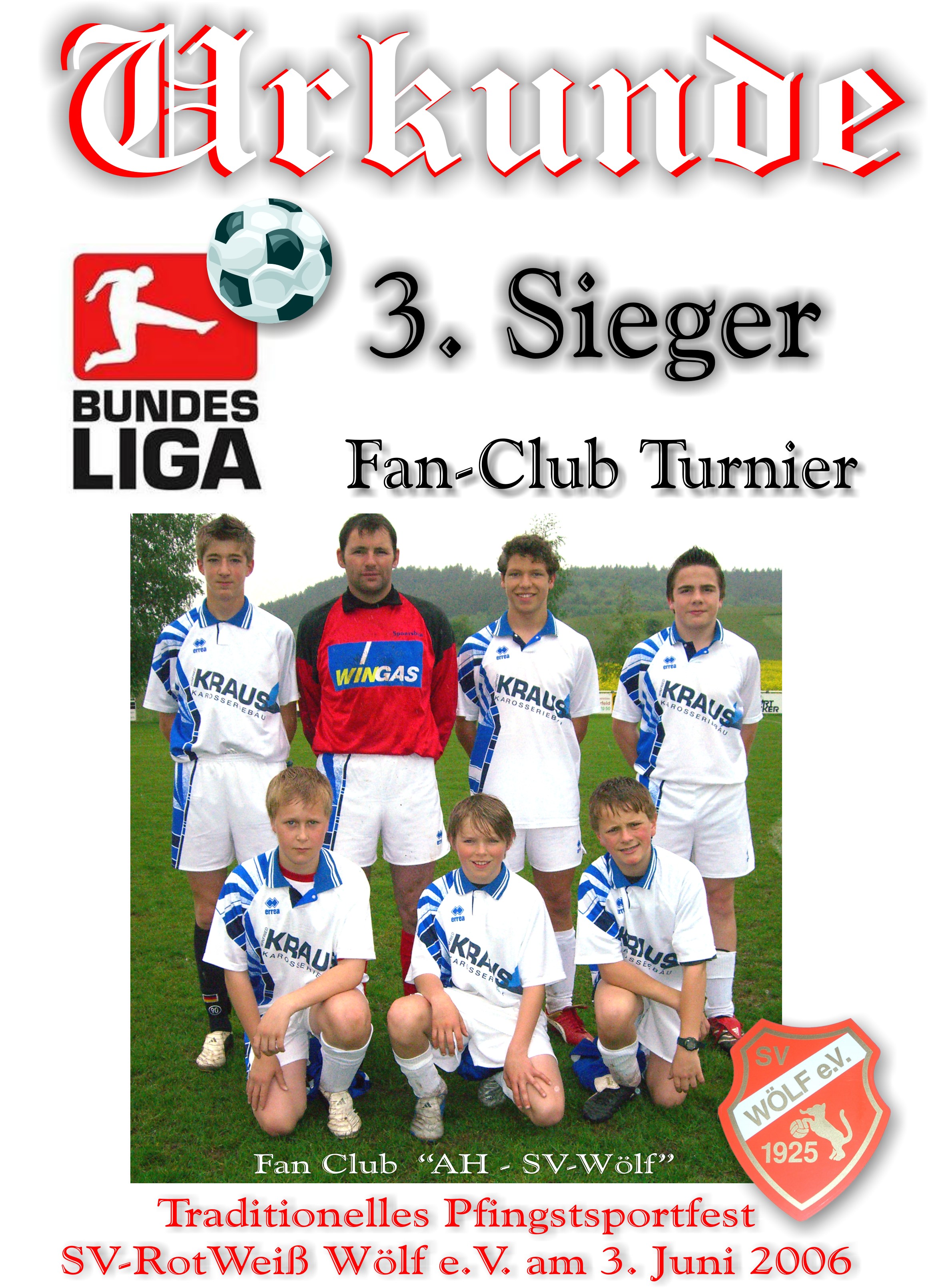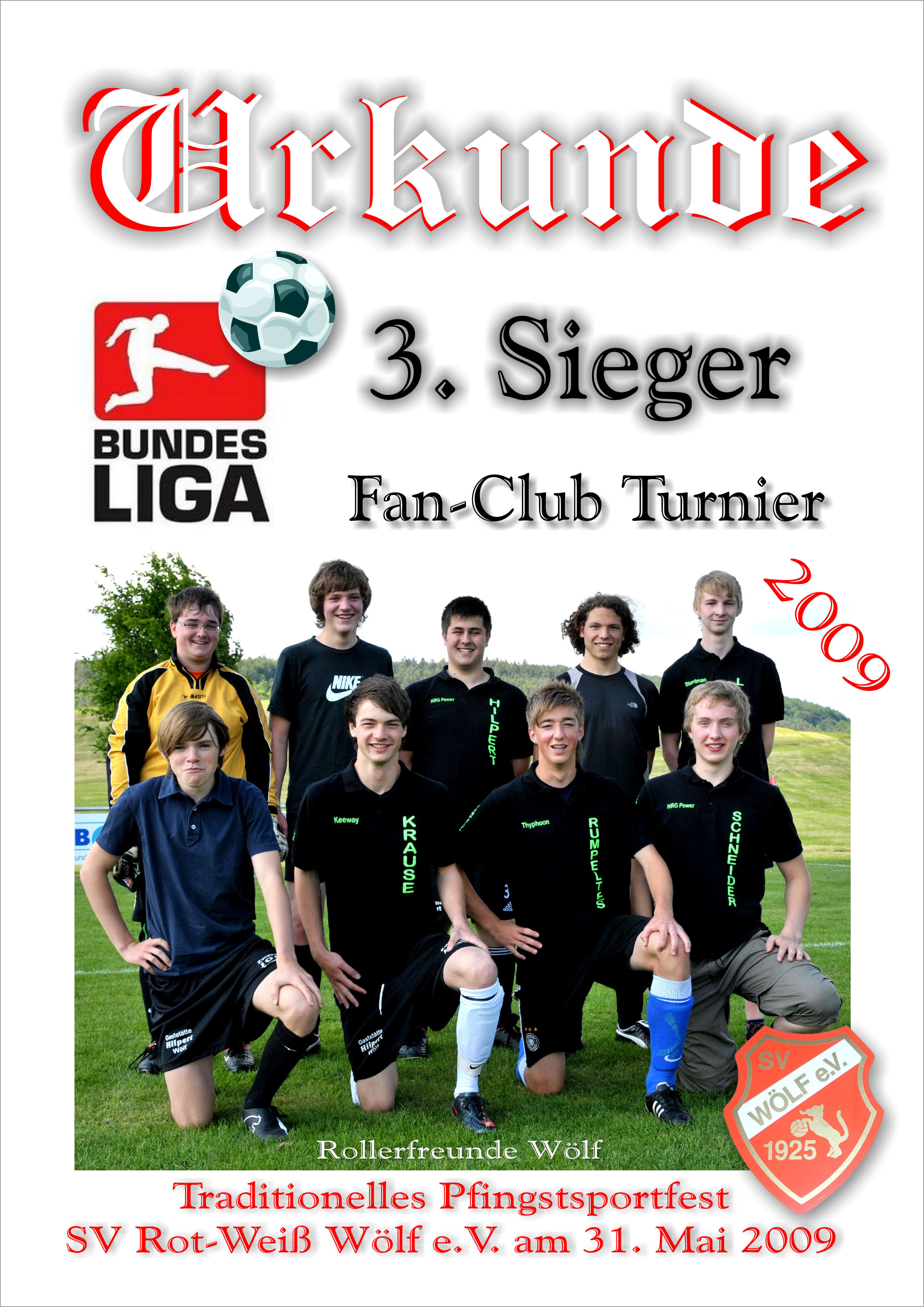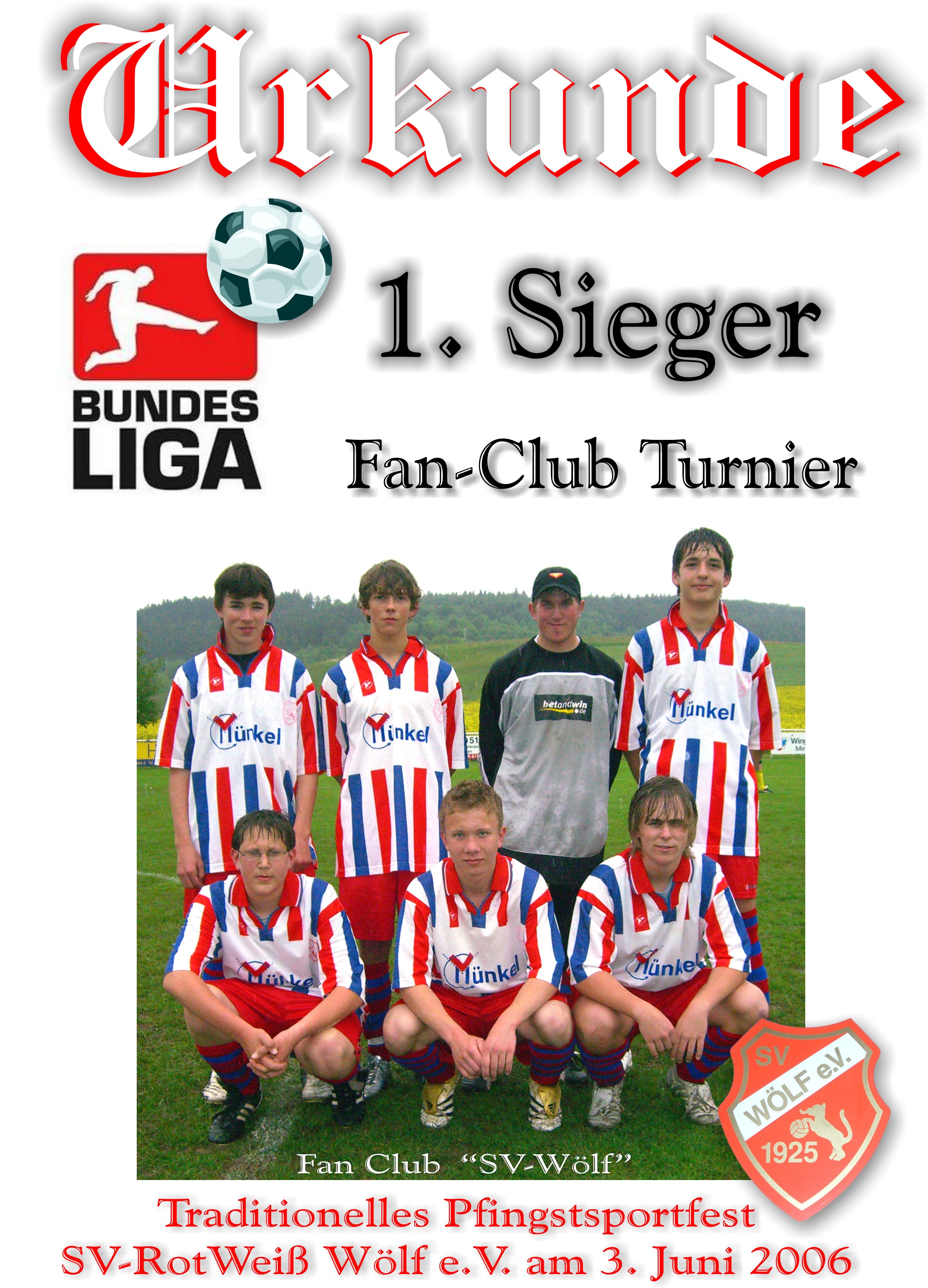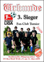 Urkunde 1. Sieger Fan-Club Wölf Bundesliga Fan-Club Turnier |