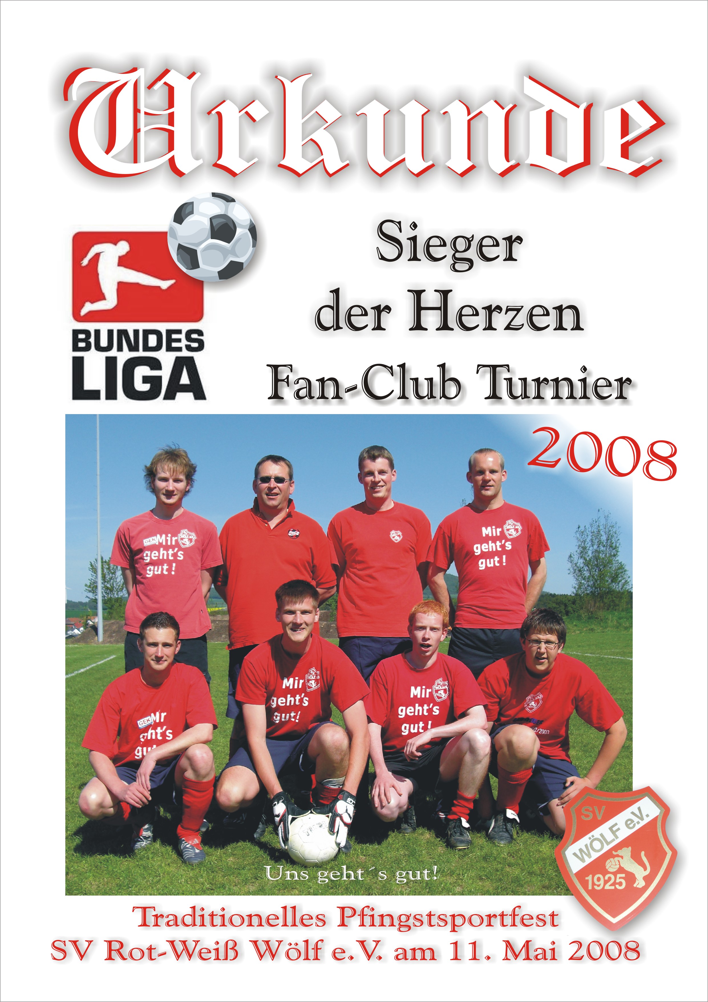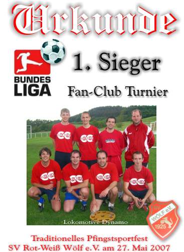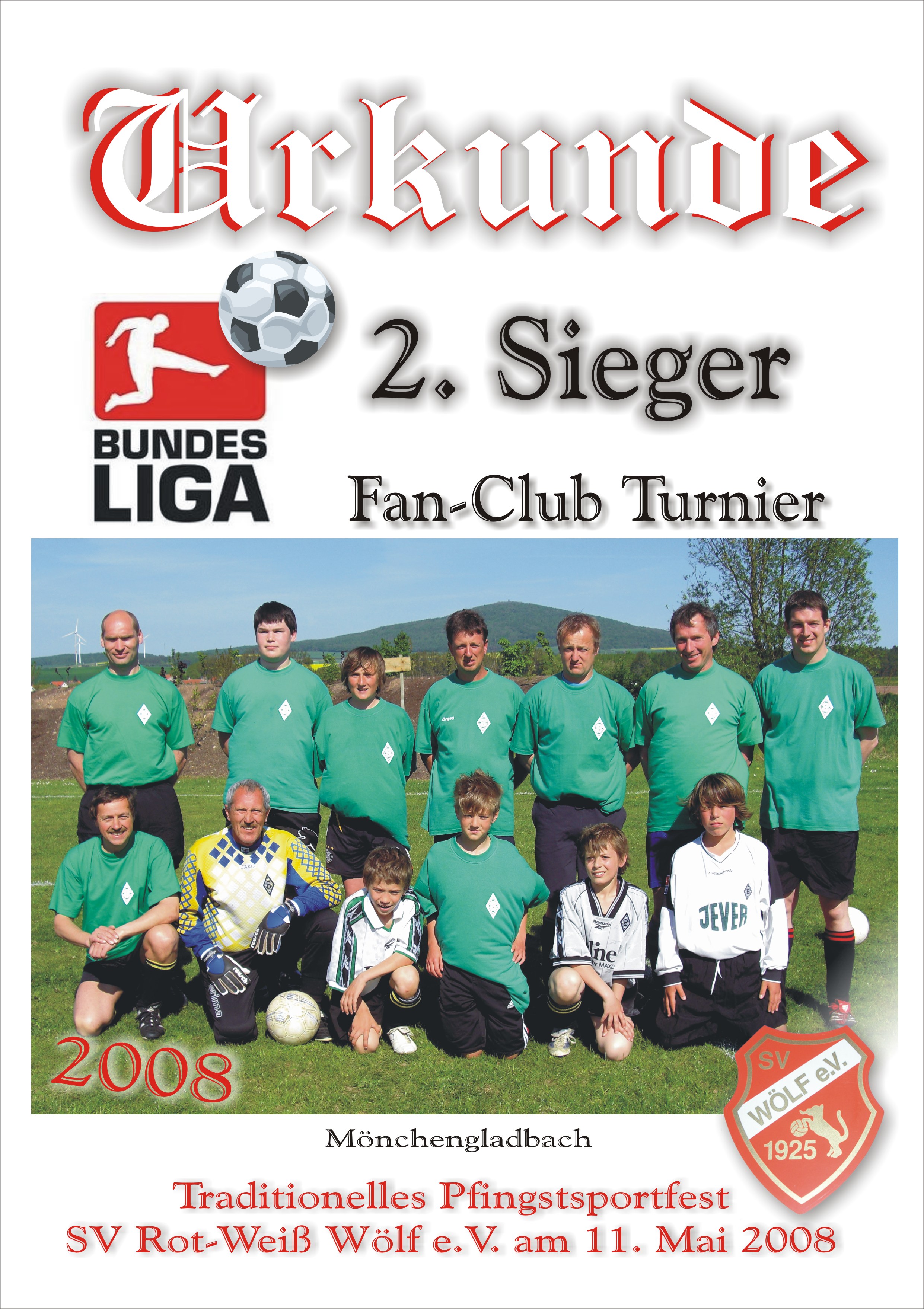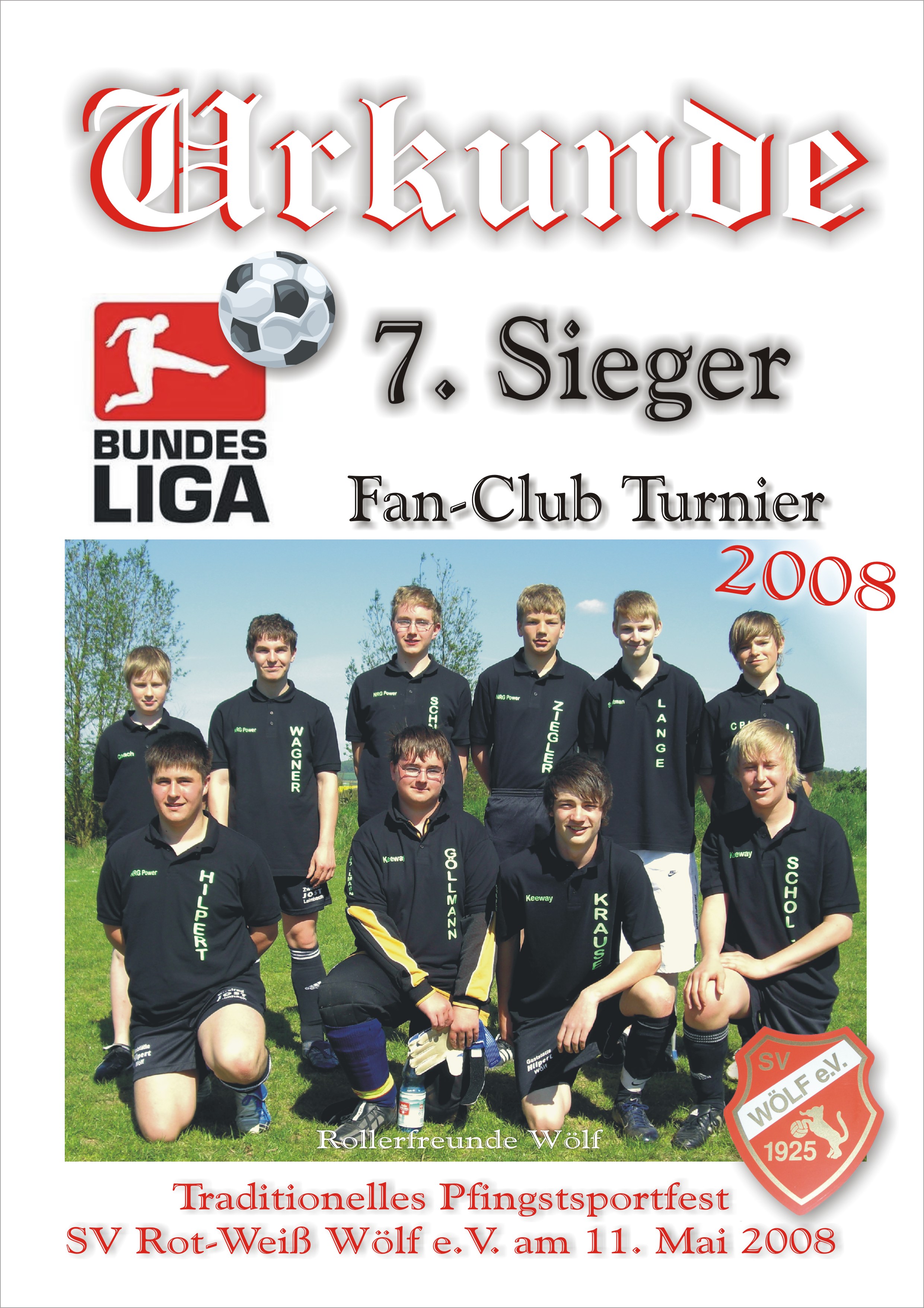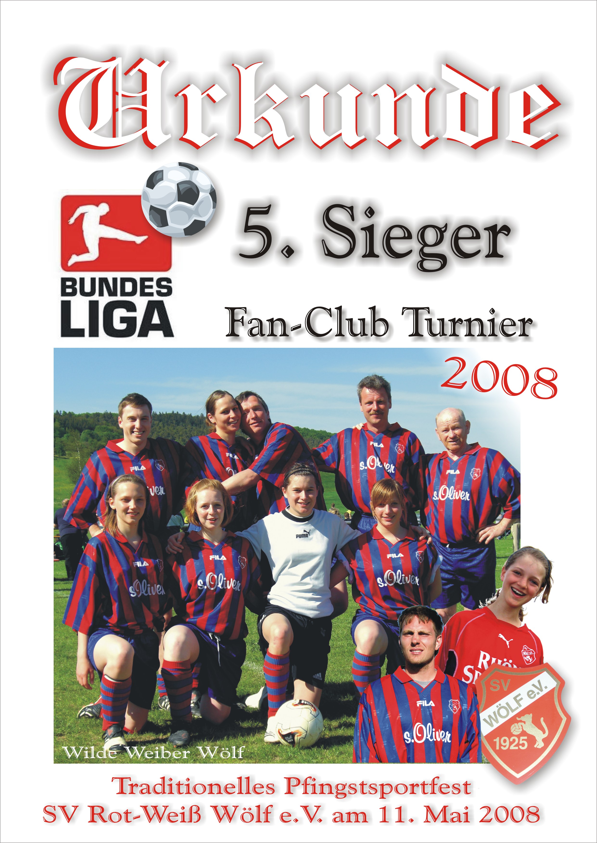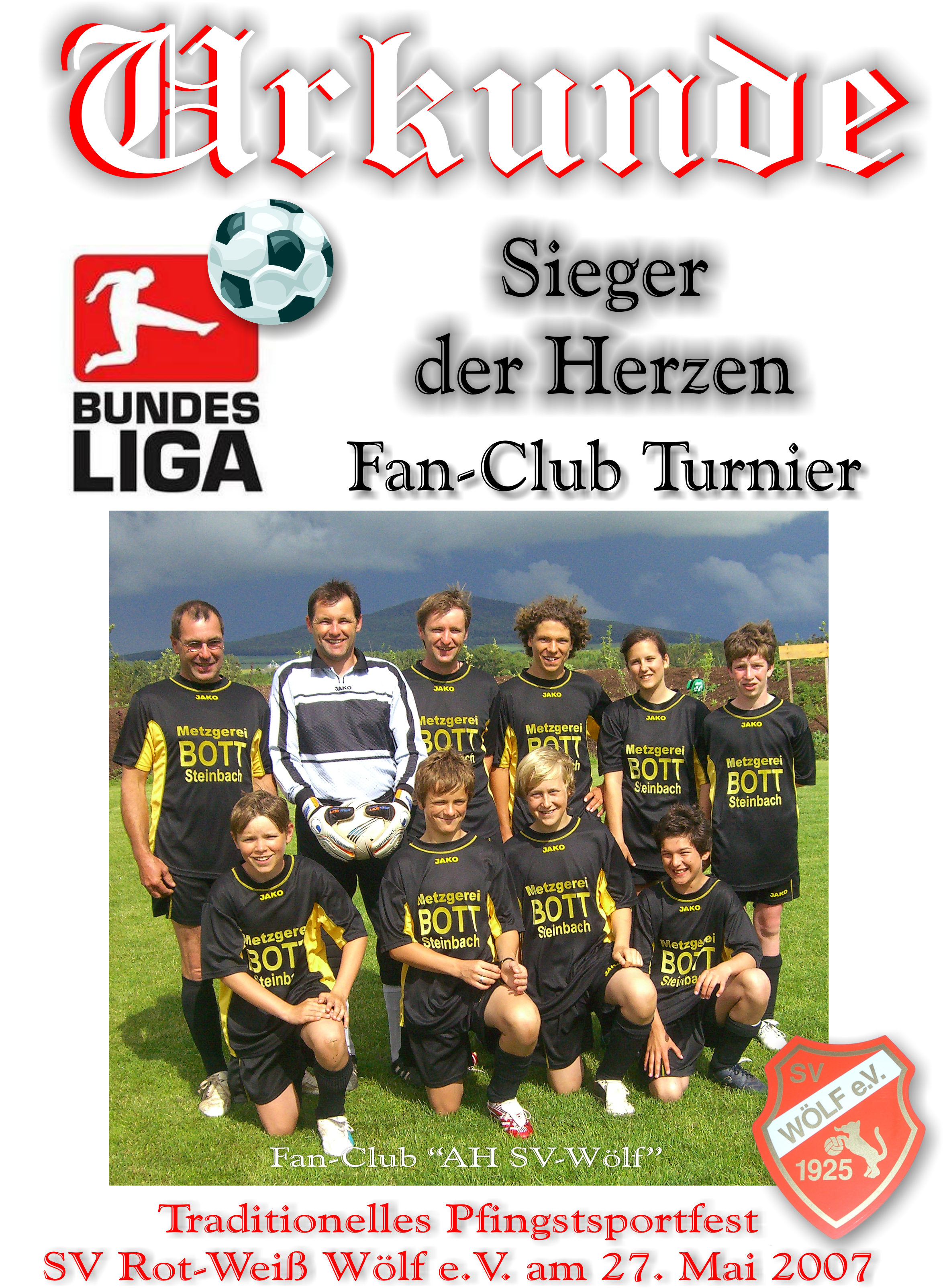 Urkunde 1. Sieger Fan-Club Wölf Bundesliga Fan-Club Turnier |