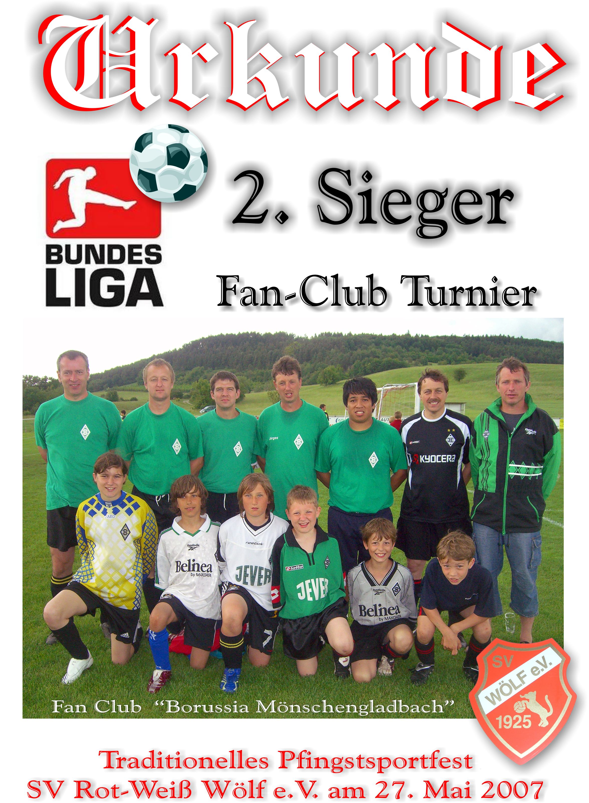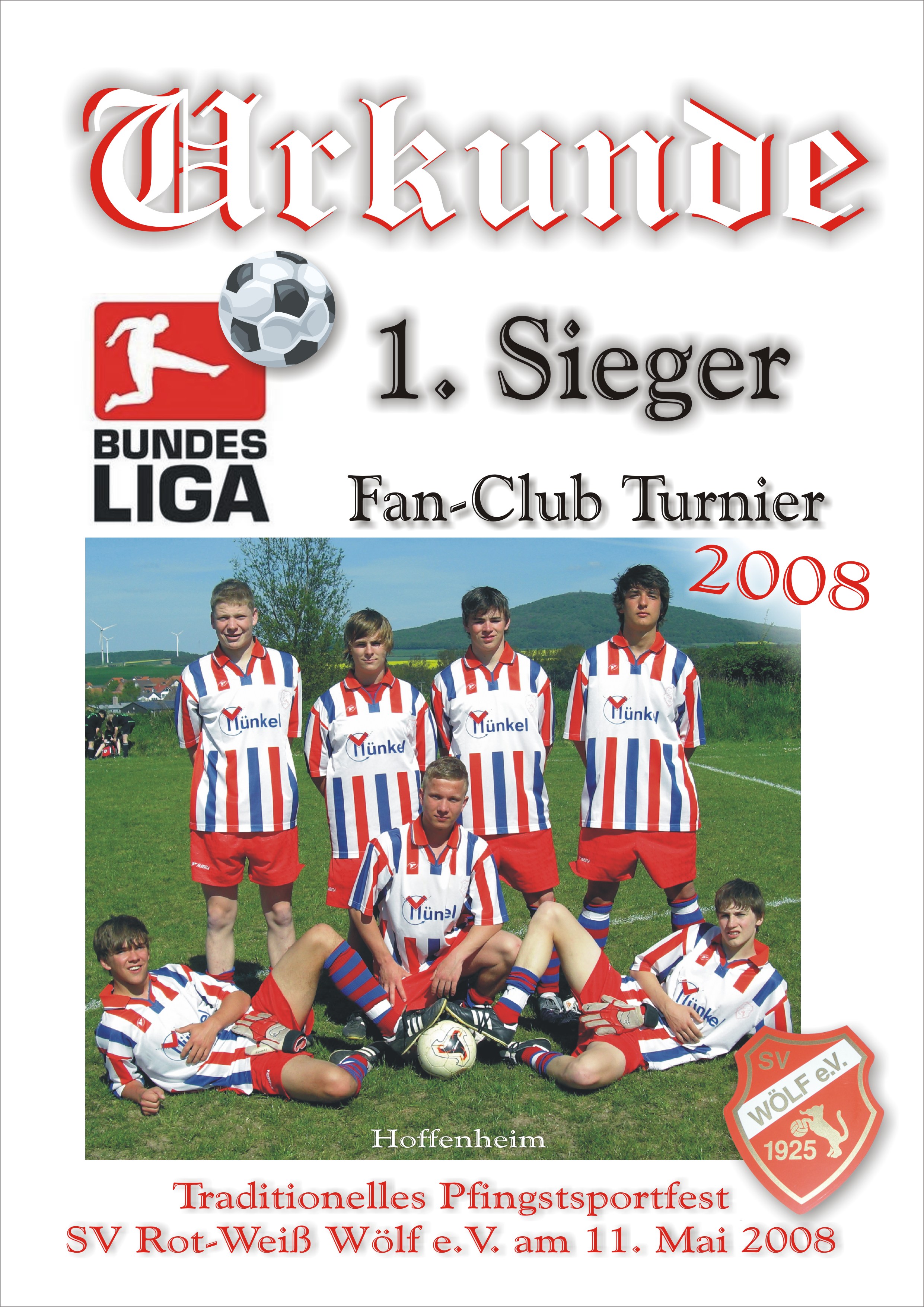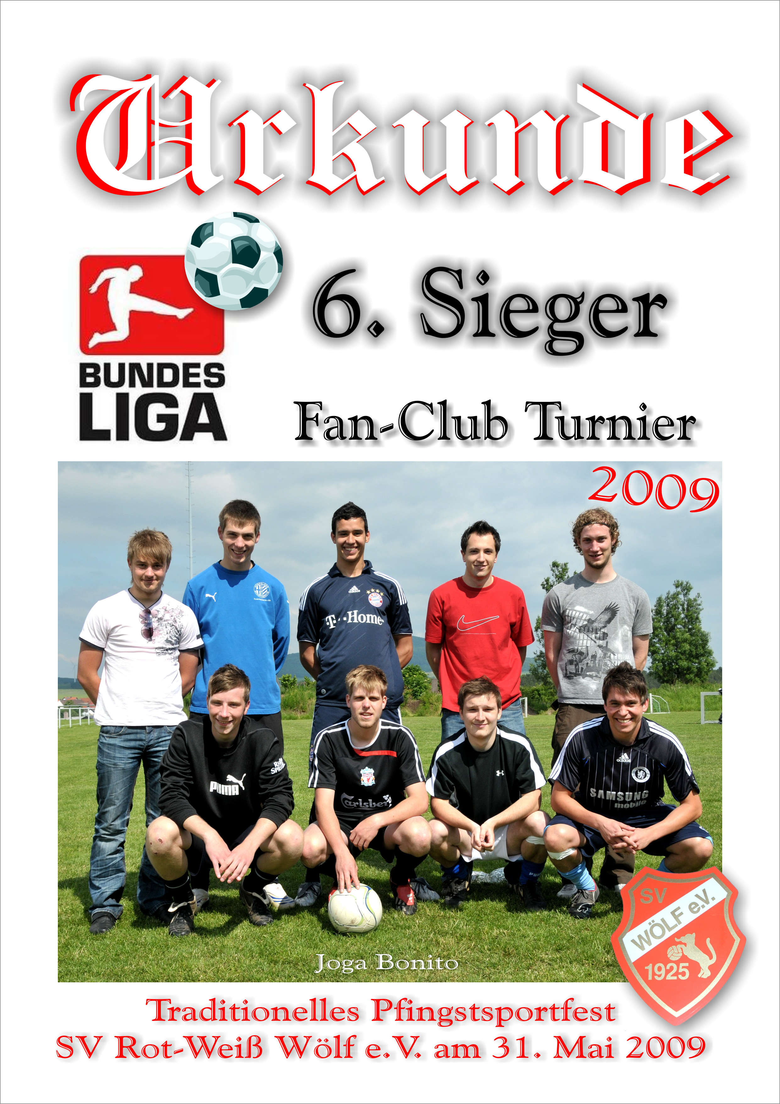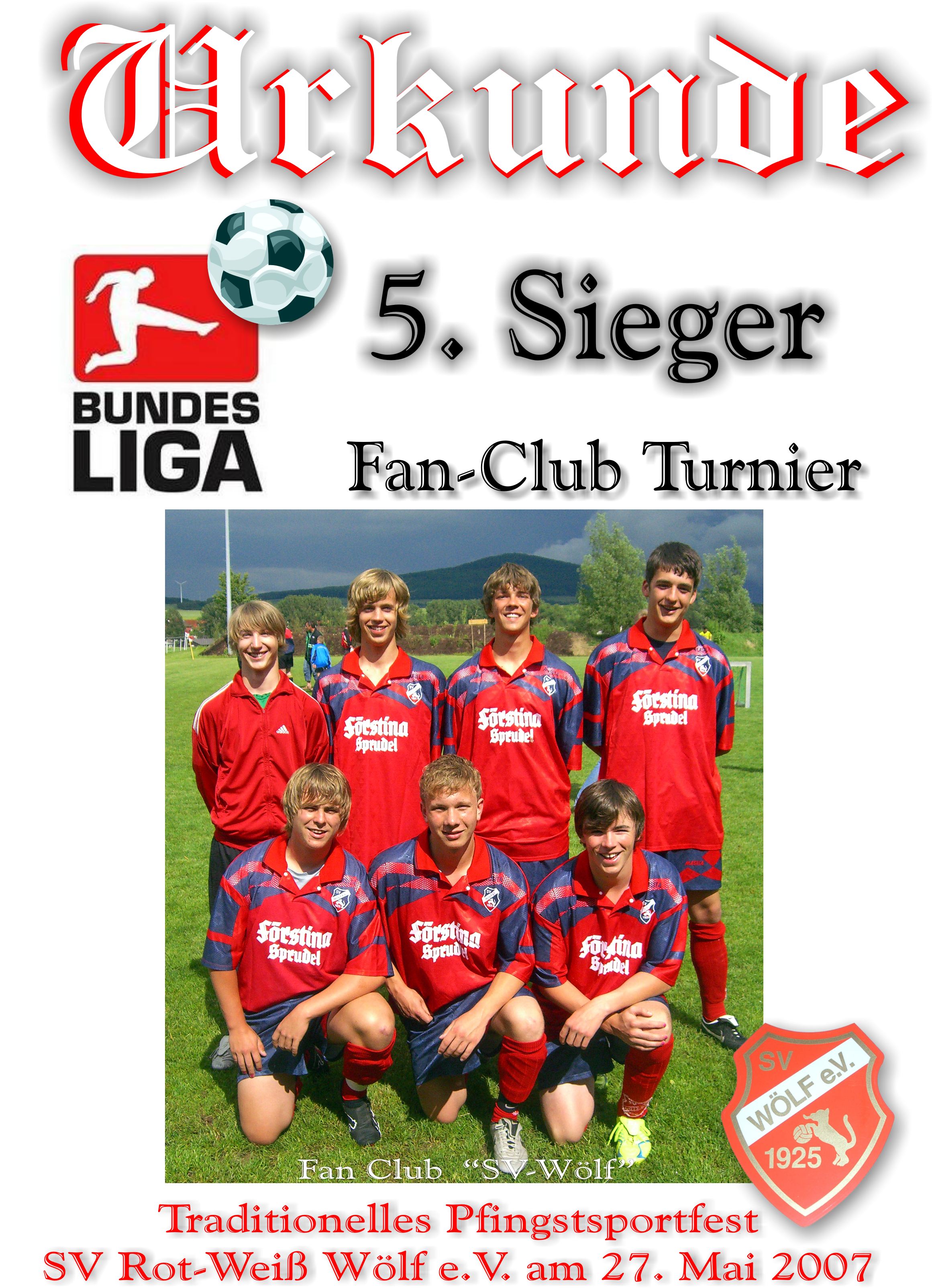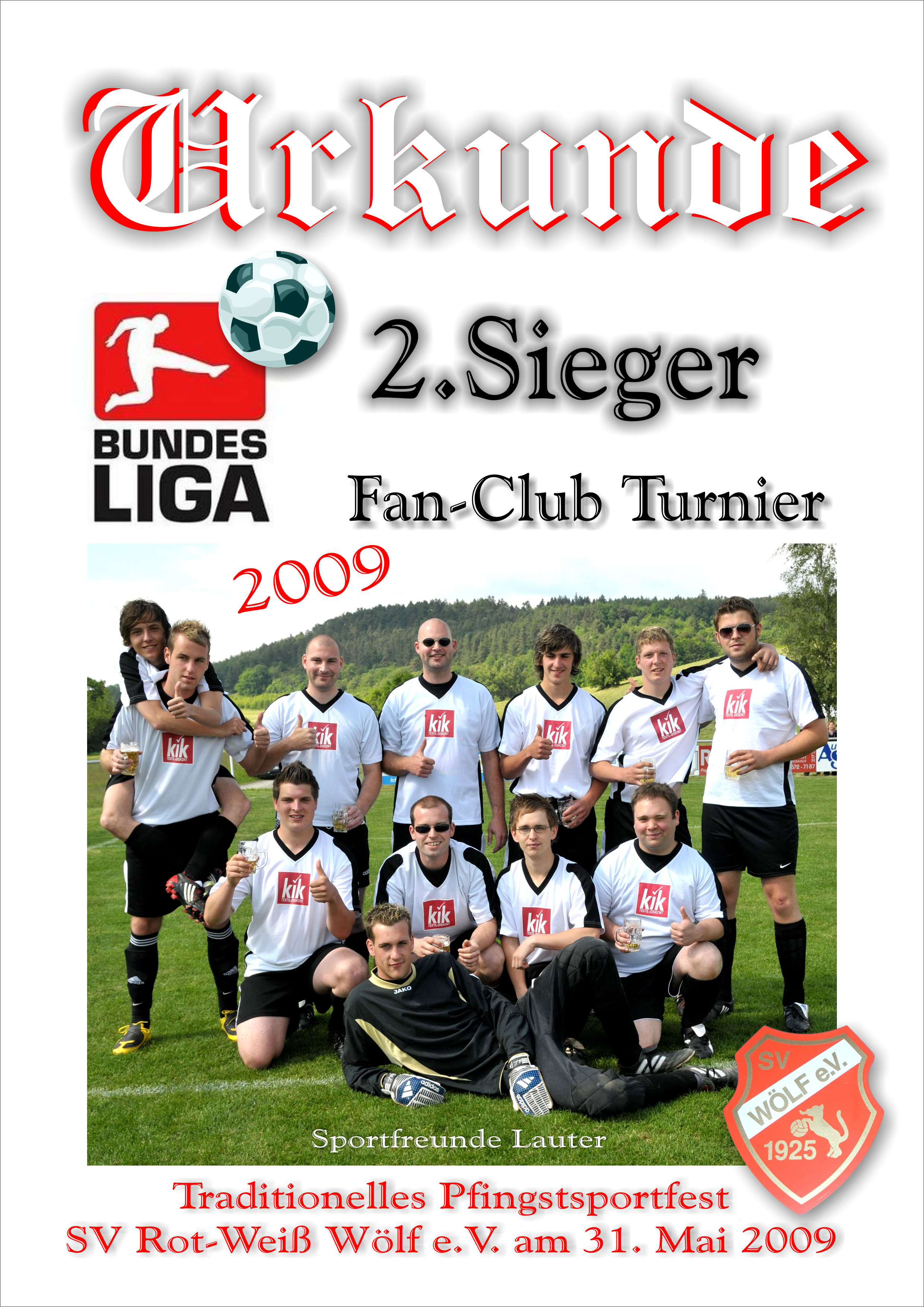Urkunde 1. Sieger Fan-Club Wölf Bundesliga Fan-Club Turnier |