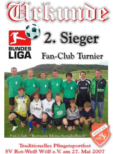 Urkunde 6. Sieger Borussia Mönchen Gladbach Bundesliga Fan-Club Turnier |
