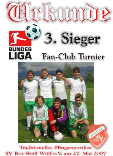 Urkunde 3. Sieger FanClub Alte Herren Wölf Bundesliga Fan-Club Turnier |